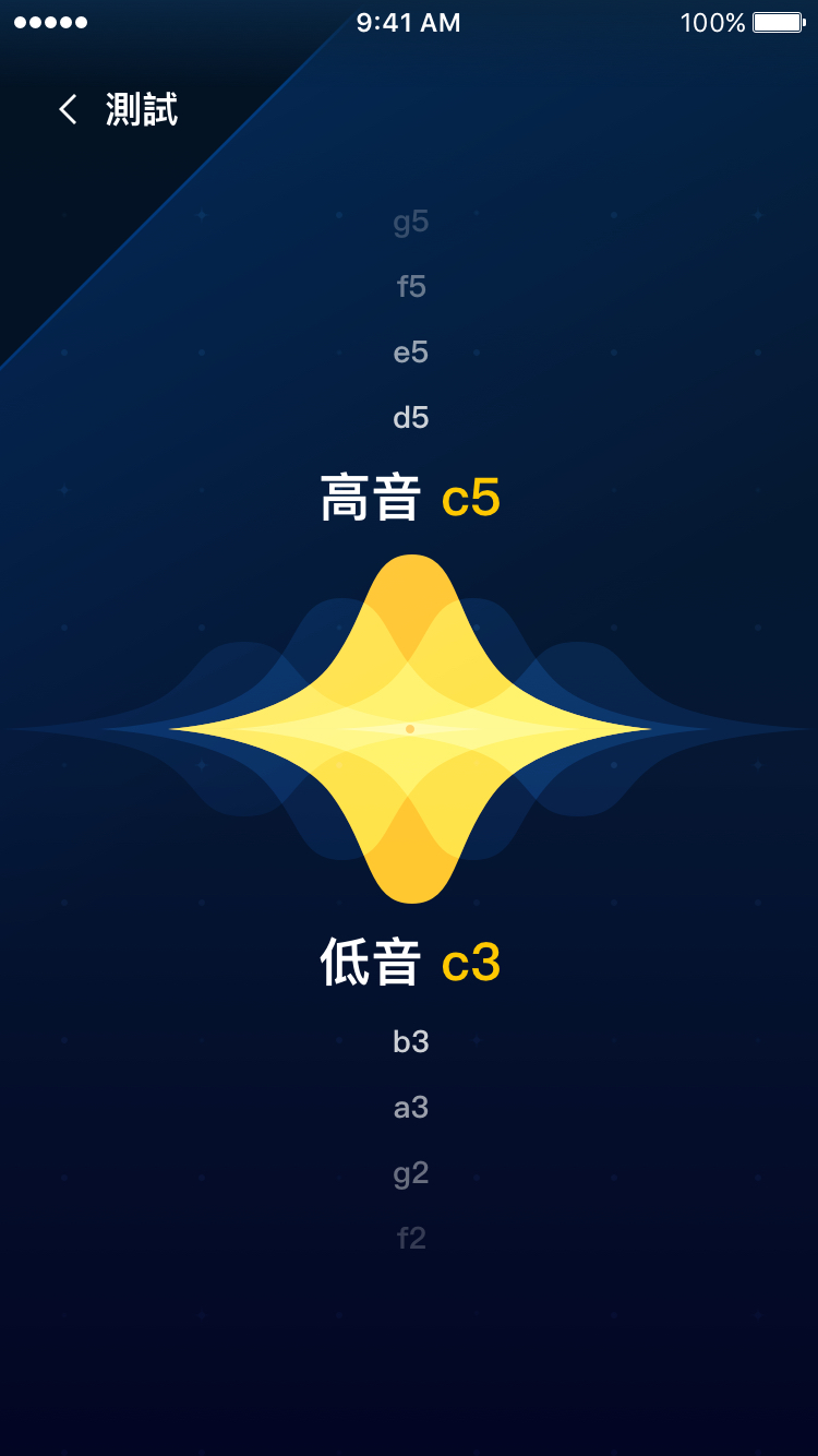 See your full vocal range (low—a2, high—a4, falsetto—c5) translated to your personal voice type (baritone)