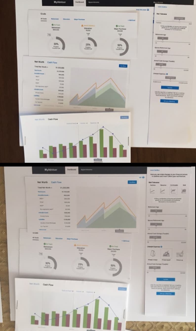 I ran multiple rounds of tests to nail down the best direction for the financial picture module. Using paper protoypes, I was able to quickly create different combinations of layout, styling, as well as information fidelity for the tests. It is also important to note that I tested existing RBC clients who would ultimately be the end users.