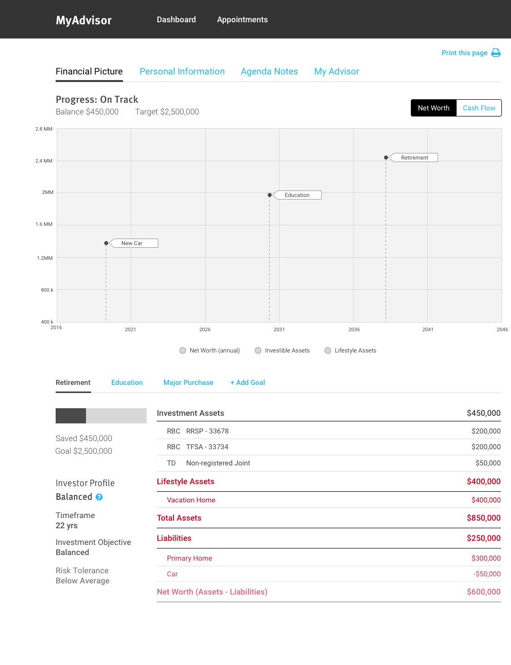 A client's financial picture is the most important piece of information when it comes to financial planning. It is the view that shows everything from assets to networth to projections. Because of that, we dedicated our brain power here to try and come up with something new.