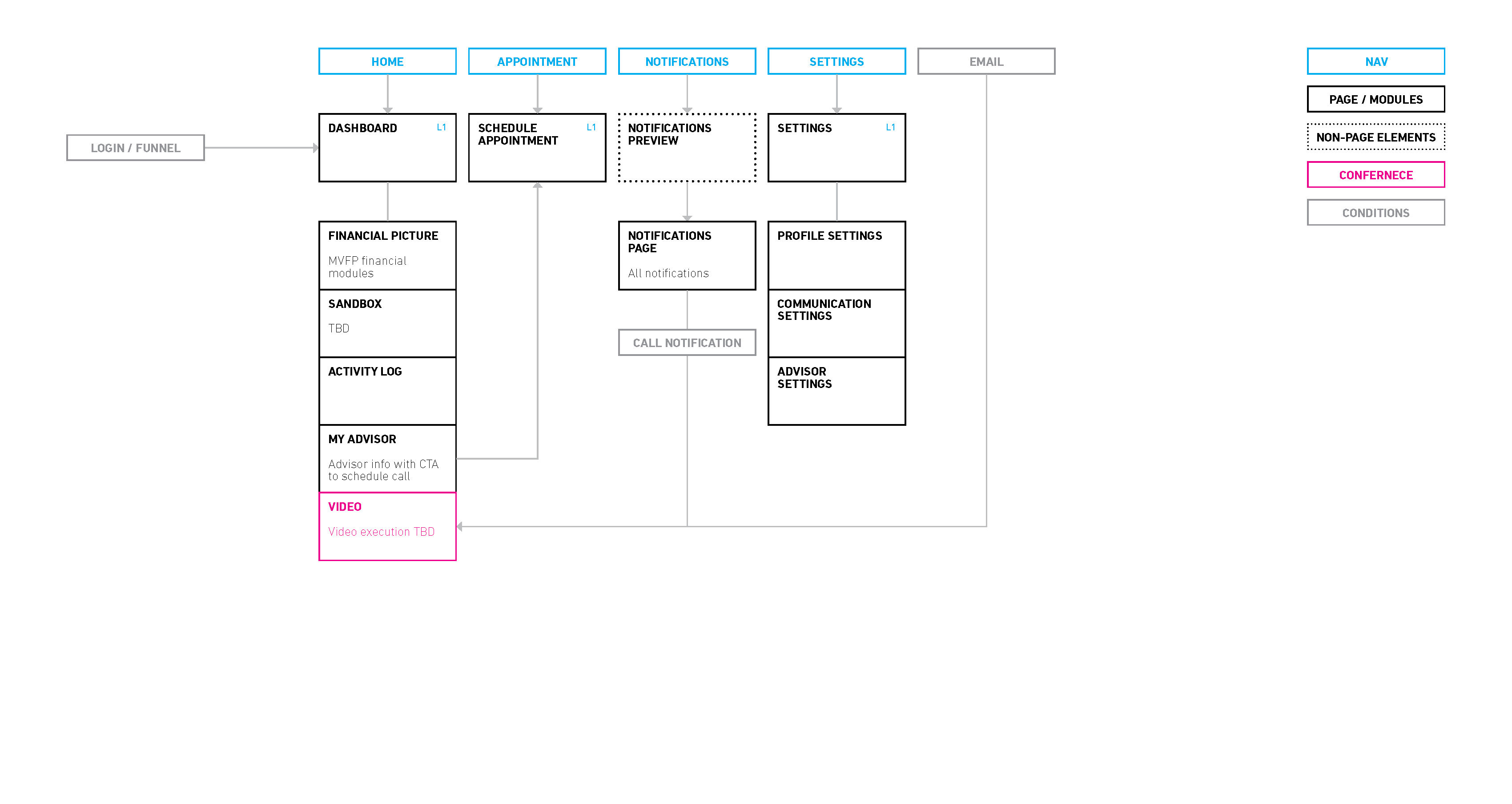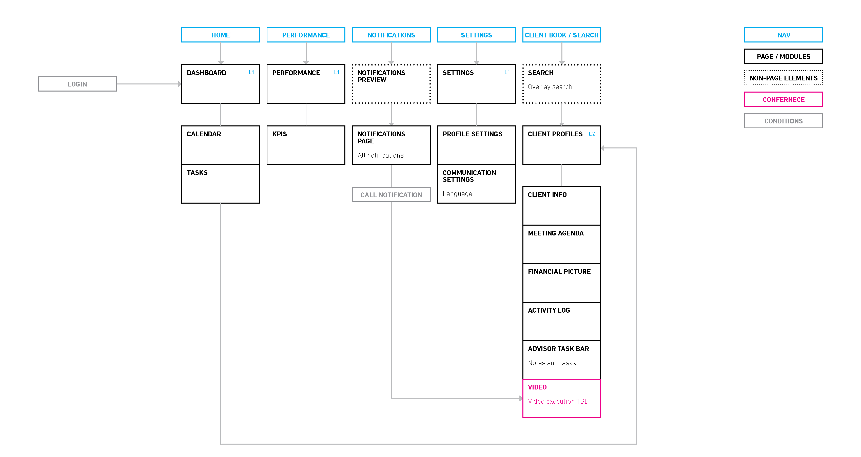 The final part before moving into UI design is to map out the IA of the client and advisor dashboards. This helps everyone in the team visualize how the whole thing comes together.