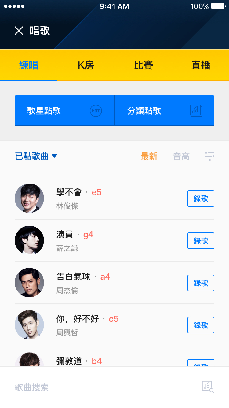 The app experience is built around 4 core modes: train, KTV, perform, and compete.